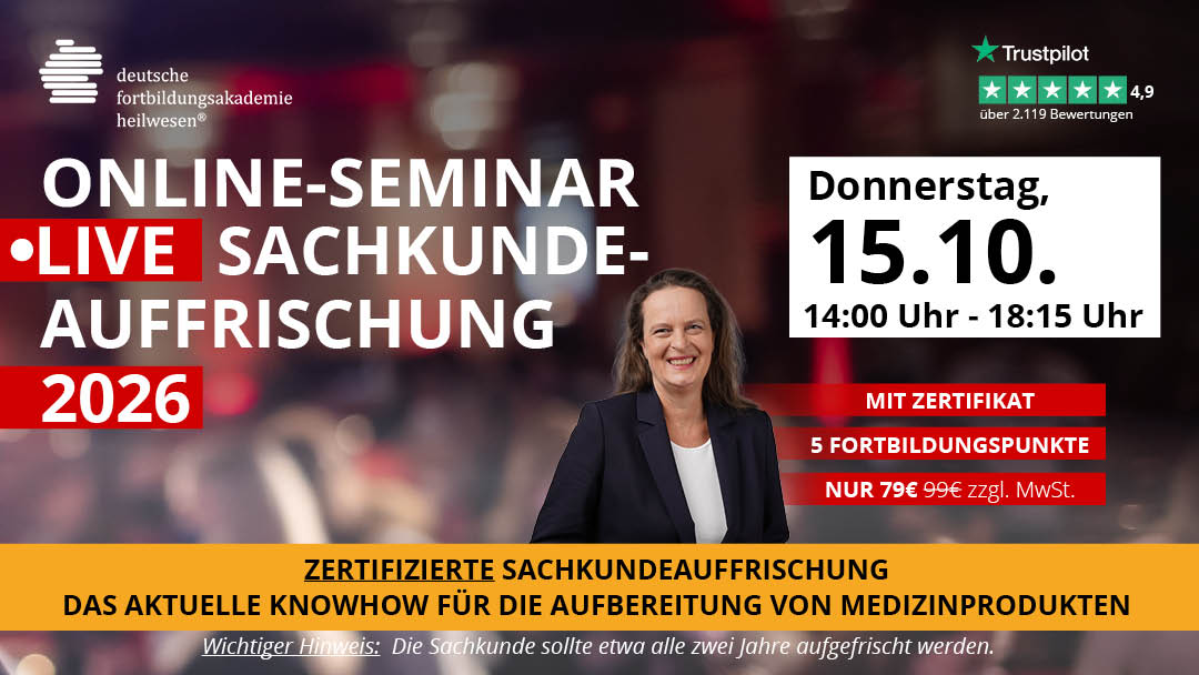 Dieses Online Live Seminar richtet sich an behandelnde Zahnärzte/innen, zahnmedizinische Fachangestellte/r, Praxismanager/innen, QM-Beauftragte/r, Hygiene-Beauftragte/r, Azubis und Quereinsteiger die ihr Wissen rund um die RKI konforme Medizinprodukteaufbereitung nicht nur für eine behördliche Begehung,- sondern vor allem für die Patientensicherheit rechtskonform aktualisieren wollen.
